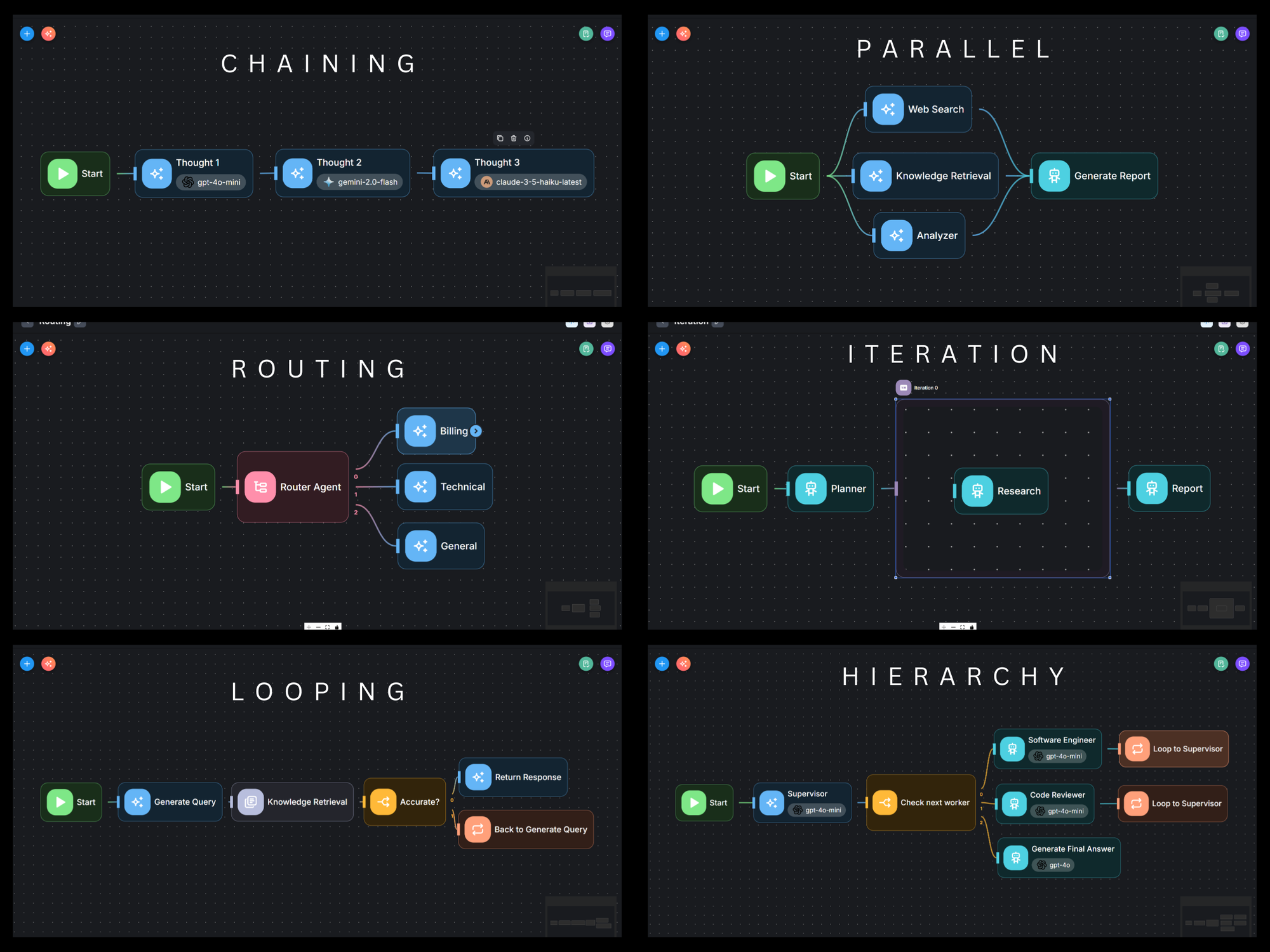 Flowise provides modular building blocks for you to build any agentic systems, from simple compositional workflows to autonomous agents. Some common patterns are: