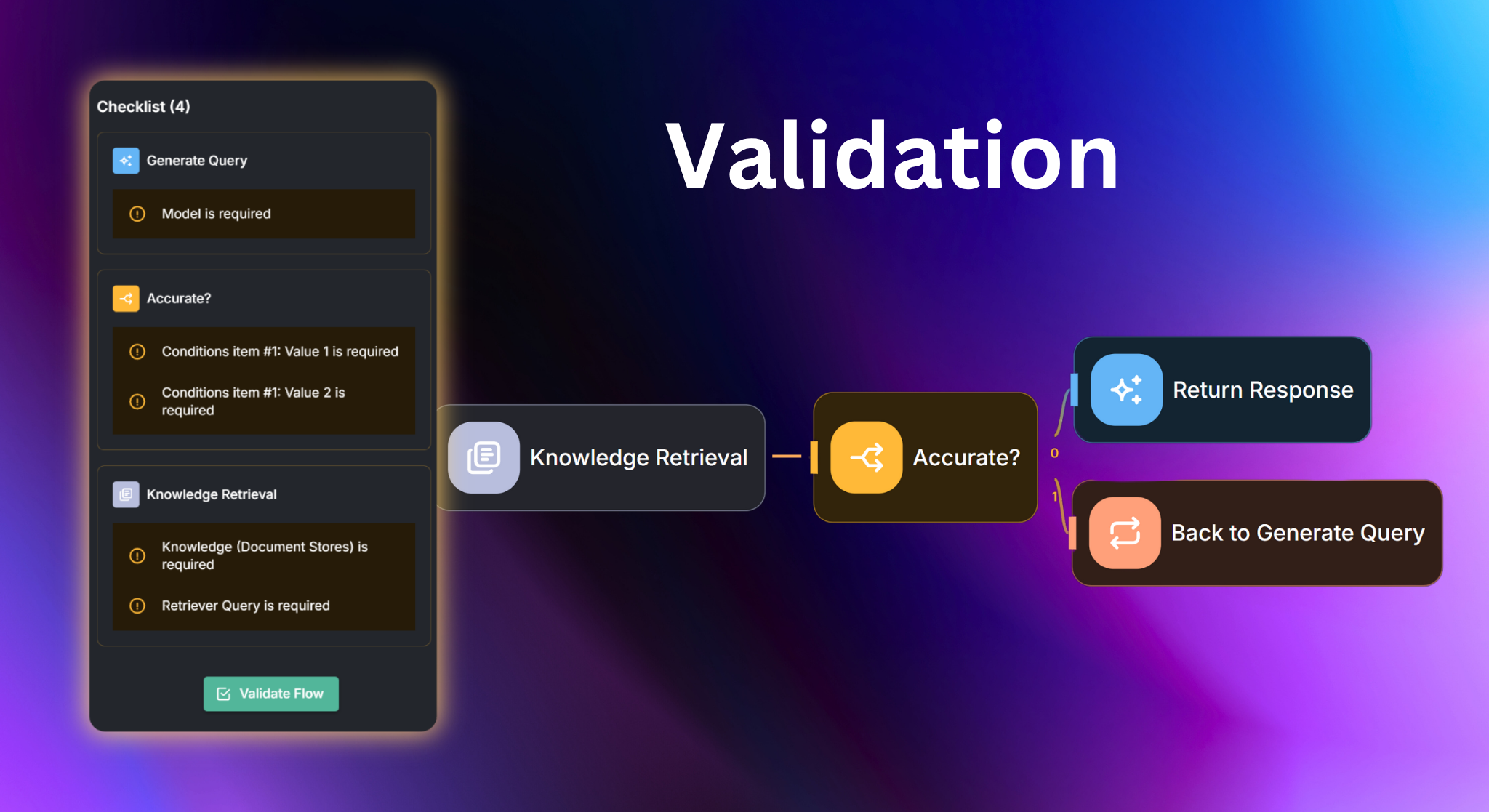 Designing complex workflows can be challenging. Flow validation helps minimize misconfigurations and human errors by automatically checking for common issues.